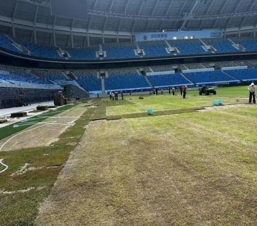 北青报记者经核实了解,因为赛前1周也就是5月10日晚,新鹏城队主场深圳市体育中心承接了歌星演唱会,导致球场内场部分区域的草皮损坏情况非常严重。