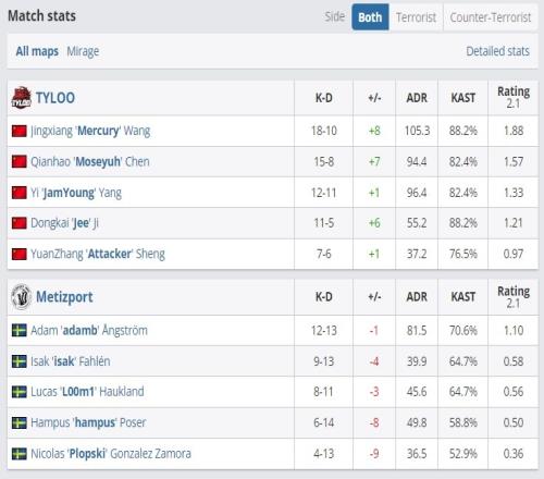 下半场:Metizport手枪局rushB区直接被包点的Mercury双枪三杀顶住,第15局长枪局,拿着MP9吹风机守B二楼的JamYoung拖到了队友回防,Tyloo三外围再拿分之后又依靠火力接住了对手的强起局拿到赛点!最后一分Moseyuh在拱门处成功双杀,Tyloo在防守方没让对手拿分!轻松结束比赛,击败对手进入了1-1组!